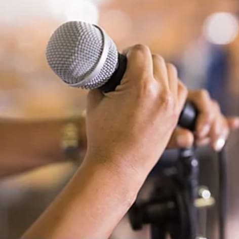 We've got your AV needs covered: 2 handheld mics, 2 lavalier mics, a sound mixing board, 2 tripod speakers, and a 75" smart TV on rolling stand that can be positioned where you need it.