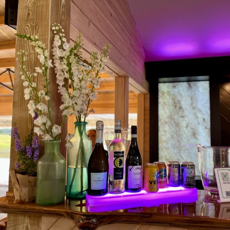 Beautiful and practical, our built-in bar is outfitted with industry-grade coolers and styled with back-lit granite wall panels and a live-edge bar top of local cypress.