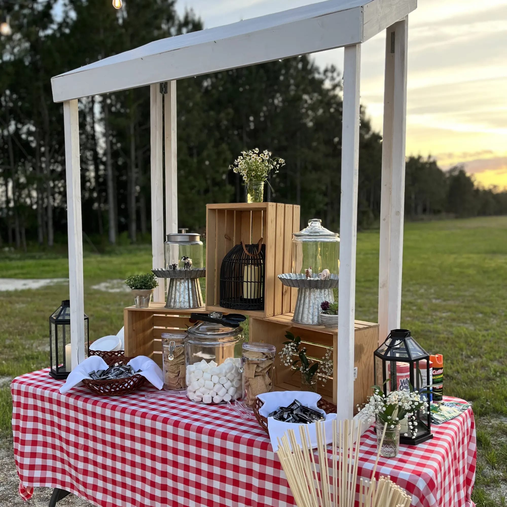 Our white market canopy, wooden crates, and apothecary jars create a beautiful bar for everyone's favorite fireside treat. Multiple linen colors available. Florals, lanterns, and roasting sticks included.